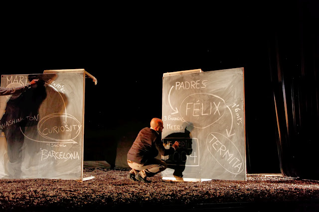 La premisa de la historia podría resumirse más o menos así: por una plaga de termitas en su apartamento, el juez Félix Hipólito, que acaba de cumplir 40 años, se traslada con su gato durante un par de días a casa de su padre, un hombre hosco y autoritario al que apenas visita. Pero los de Titzina nos lo van a contar a su manera (y con ecos deRobert Lepage). Para ellos, la historia comienza antes, el 15 de abril de 2004, cuando el robot espacial Curiosity emprende su viaje a Marte, "planeta cálido y húmedo en su origen", nos dice el narrador, "pero convertido en un lugar hostil y frío". Ese mismo día, en Barcelona, los padres de Félix, a punto de ser nombrado juez, discuten acerca de la ceremonia. Y a tres paradas de metro, una termita comienza a horadar una viga (acabo de teclear "una vida") del piso del flamante magistrado. Es un sugestivo procedimiento, pero quizá tenía la noche lerda, porque me costó un poco entrar en el juego, aunque pronto me atrapó la intensa humanidad de los personajes. Félix vive solo, como su padre. Se ha separado varias veces y no logra mantener una relación estable. Intenta hacerlo todo "lo mejor posible", lo que le lleva a una actividad febril. Cuando un psicólogo le pide que recuerde 20 momentos positivos de su vida no lo consigue. Sueña con su madre, pero en esos sueños ella habla con la voz paterna. Diego Lorca interpreta al juez. Su trabajo, impecable y solo aparentemente sencillo, muestra con gran riqueza de matices el crecimiento y desborde de la turbulencia que le come el alma. Pako Merino, versátil como un moderno Peter Sellers, da vida a los restantes personajes. En un tour de force similar a la ronda de pésames de Exitus, despliega ante nosotros un carrusel de encausados, con rotunda naturalidad, sin forzar los registros ni buscar efectos cómicos: le basta un quiebro gestual, un cambio en el tono de voz, o en la colocación del cuerpo o del jersey, para transformarse en un borracho olvidadizo, una mujer abandonada, un ladrón de supermercados, y más tarde, en creciente progresión dramática, un padre divorciado que se niega a pagar la custodia de su hija y un muchacho que agredió a su madre. Luego será también un técnico en control de plagas (que atiende por el singular nombre de Roger Tenias), un juez forense y, por encima de todo, el padre de Félix. Ahí rozamos el portento: Merino se convierte en un hombre de andadura lenta, hablar preciso y rostro severo e inmutable, que recuerda al lejano Antonio Casal.